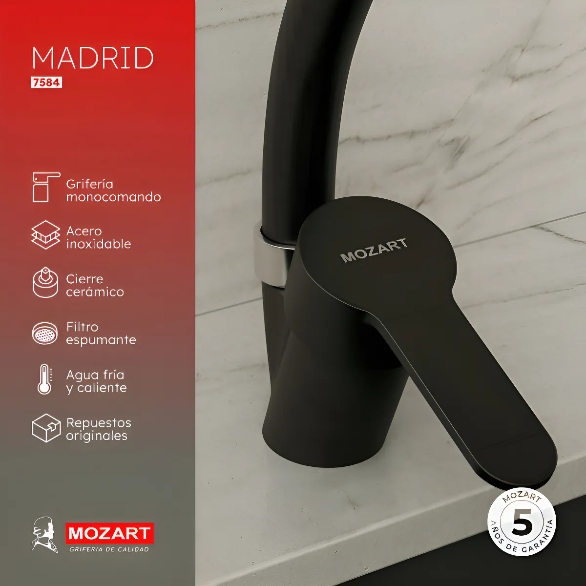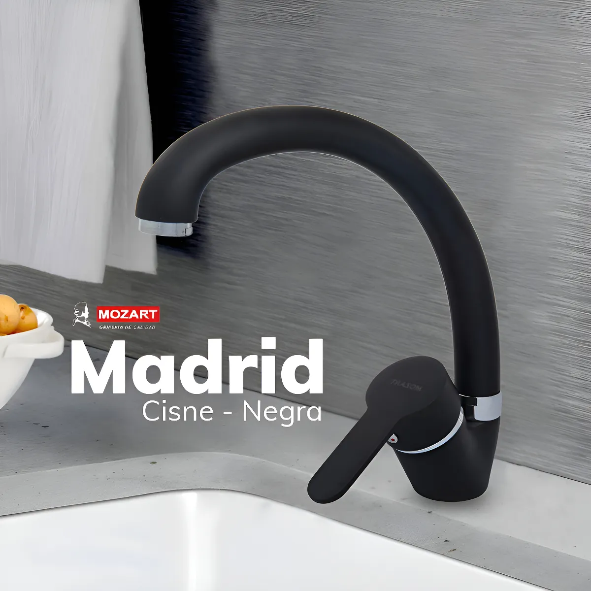 La grifería Mozart para cocina monocomando, modelo Madrid, en la línea cocina mesada, con pico cisne y acabado en color negro, es una opción moderna y sofisticada para cualquier cocina. Su diseño estilizado y elegante, con un pico cisne de líneas curvas, le da un toque único y contemporáneo. Gracias a su sistema monocomando, permite ajustar de manera sencilla el flujo y la temperatura del agua con una sola mano, brindando comodidad y eficiencia. El color negro aporta un contraste atractivo y se adapta fácilmente a diferentes estilos de decoración, desde cocinas minimalistas hasta las más industriales. Esta grifería es ideal para quienes buscan una pieza de alta calidad, duradera y con un diseño que resalta en el espacio de la cocina.