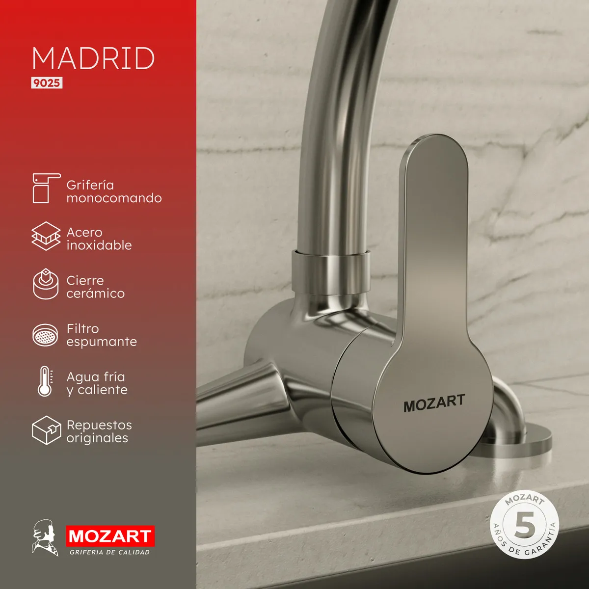 Grifería Cocina Canilla Monocomando Mozart Madrid Mezcladora Pico Cisne Color Cromado 9025