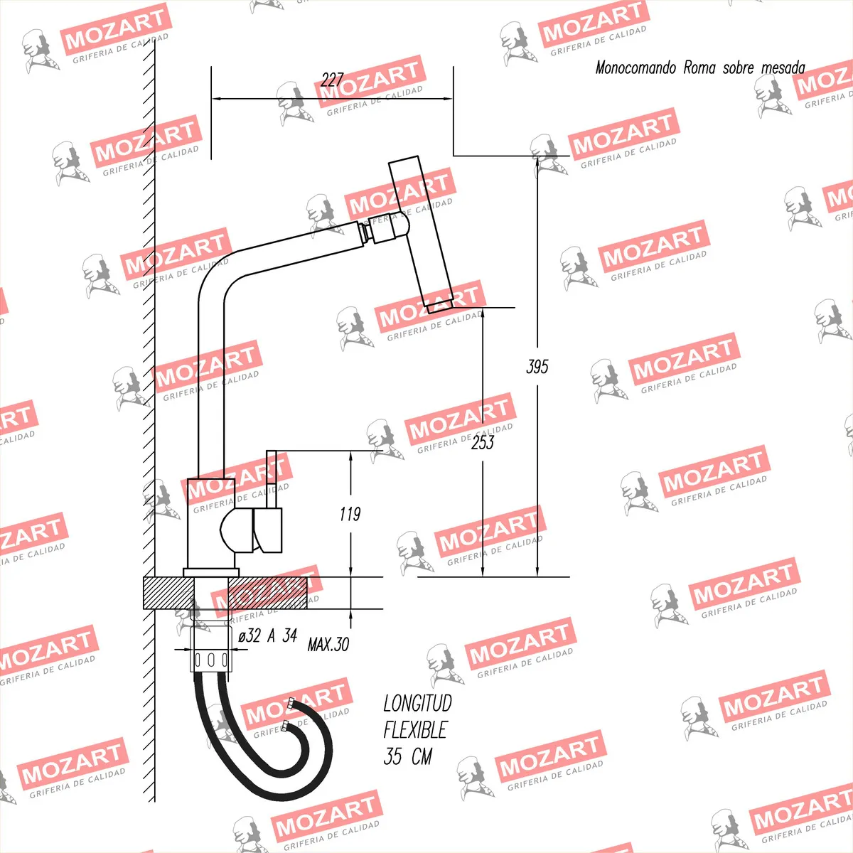 La grifería Mozart Cocina Monocomando sobre Mesada Pico Móvil 360° modelo Roma, de la línea Premium en color negro, es una opción de diseño elegante y alto rendimiento para tu cocina. Su acabado en negro mate le otorga un estilo moderno y sofisticado, convirtiéndola en el complemento perfecto para ambientes de cocina contemporáneos.
