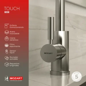 La grifería Mozart para cocina modelo Touch de la línea Premium es una opción sofisticada y de alta calidad que combina tecnología avanzada con un diseño moderno. Este modelo monocomando permite un control preciso del flujo y la temperatura del agua con un solo movimiento, mientras que la función Touch ofrece la comodidad de encender o apagar el grifo simplemente con un toque en el cuerpo del grifo, evitando el contacto directo con manijas y mejorando la higiene. Su acabado en color cromado aporta un brillo duradero y una apariencia elegante, además de ser resistente a la corrosión y al desgaste diario. El diseño de la línea Premium asegura una experiencia de uso superior, brindando tanto funcionalidad como estilo a tu cocina. Ideal para quienes buscan calidad, modernidad y facilidad en el manejo del agua.